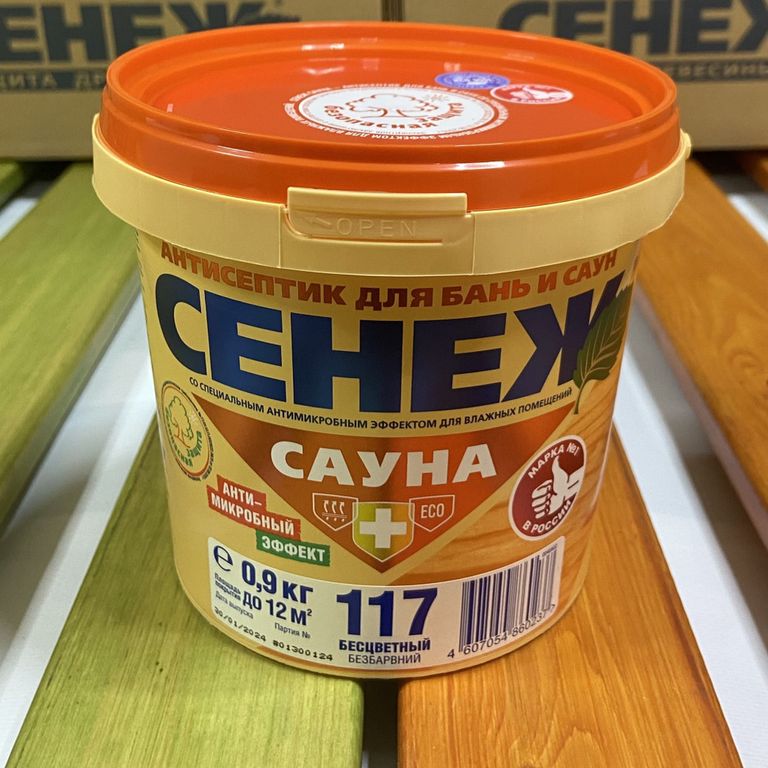 Антисептик Сенеж Сауна предназначен для защиты древесины внутри бань и саун от плесневых, окрашивающих и дереворазрушающих грибов, водорослей и насекомых-древоточцев в условиях интенсивного циклического увлажнения и воздействия высоких температур. Впервые на рынке, благодаря дополнительному антимикробному эффекту, Сенеж Сауна уничтожает бактерии — возбудители инфекционных заболеваний людей (E.coli, B.subtilis, B.cereus и др.), характерные для мест общего пользования.